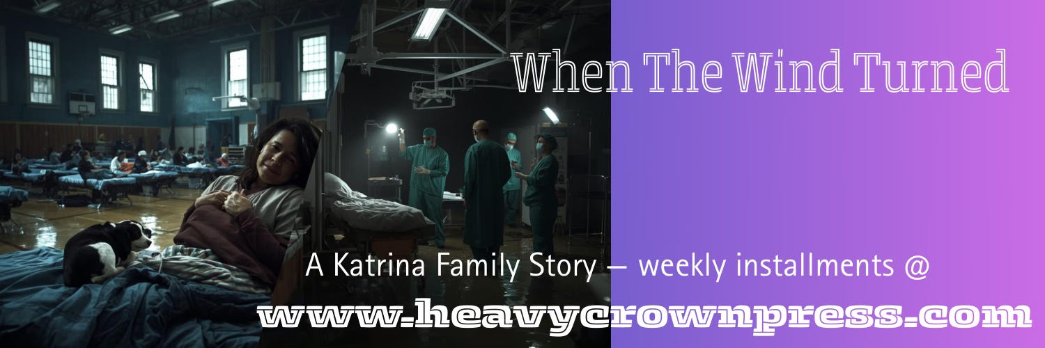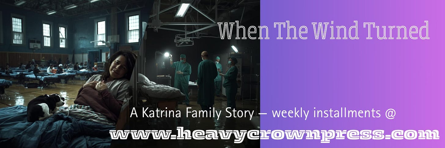 Last week in Chapter Five, Jeremy Rosenfeld fought to save lives inside a darkening, flooding Charity Hospital as Hurricane Katrina swallowed New Orleans street by street. In Uptown, Frankie and the kids sheltered in the gym of St. Genevieve of the Sacred Heart as the storm intensified. When the National Guard finally reached their sector, Guardsman John D’Agostino pulled Frankie aside with news that would change everything: Charity Hospital was in crisis — and Jeremy was still inside.